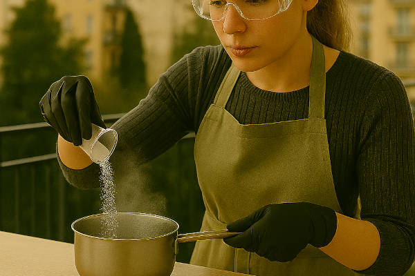 Go to a well-ventilated place, such as near an open window or on a balcony. Weigh the caustic soda, then slowly add it into the pot of water (never the other way around).