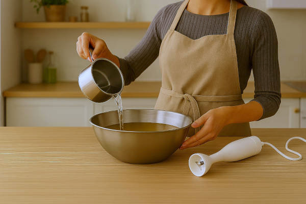 Carefully pour the lye water into the oil bowl, and use a stick blender to mix.